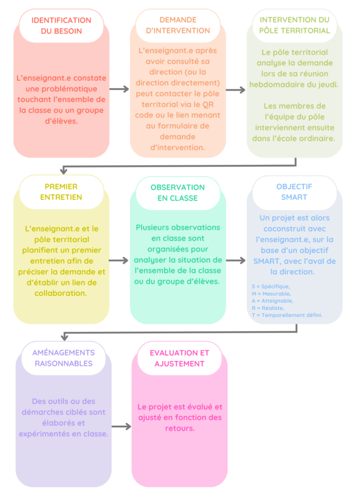 Son rôle demeure central : il ou elle reste l’expert.e de sa classe et de ses élèves. Le pôle, quant à lui, intervient en soutien, pour réfléchir avec l’enseignant.e et proposer des pistes d’action concrètes.