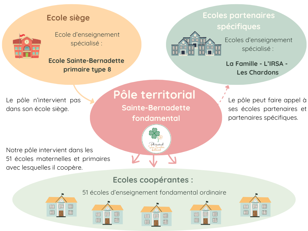 Notre Pôle territorial Sainte-Bernadette fondamental est rattaché à l’école spécialisée Sainte-Bernadette (enseignement de type 8), qui accueille des élèves présentant des troubles de l’apprentissage. Il s’agit de notre école siège, c’est-à-dire l’établissement de référence du pôle territorial. Toutefois, nous n’y intervenons pas directement.